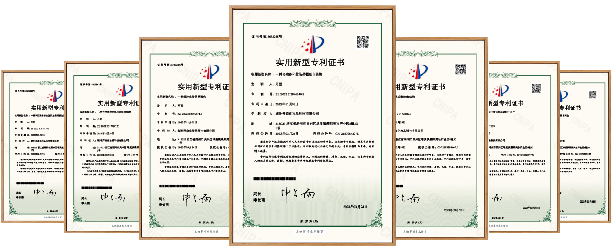 經過多年的研發(fā)創(chuàng)新,湖州開森現(xiàn)擁有【一種便攜式散粉盒結構】、【一種多功能化妝品易揭紙卡結構】、【一種方便攜帶的紙卡式粉餅結構】、【一種雙腔混合擠出型化妝品易撕包】、【一種雙腔掰折擠出型化妝品掰折打開片】、【一種單腔掰折擠出型化妝品掰折打開片證書】等多種專利,可以根據(jù)客戶的不同需求,進行深度創(chuàng)新,滿足市場和產品日益更新的需求。
